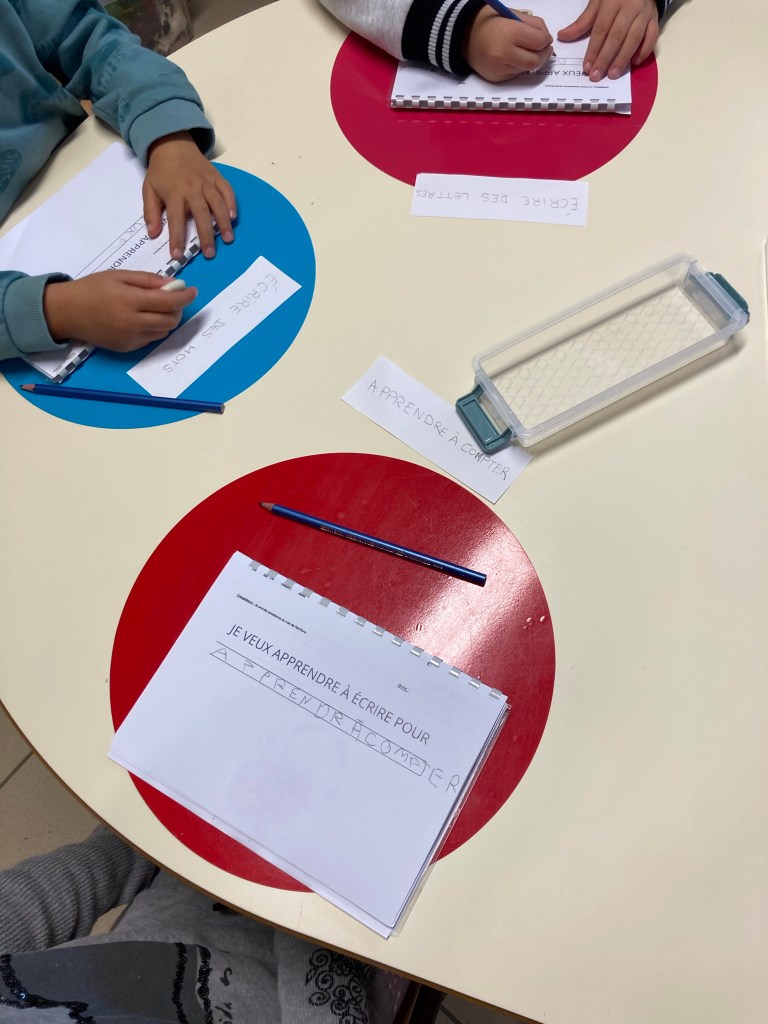 En attendant, nous avons utilisé ce matériel dans un autre travail qui existe la création de l’affichage de l’alphabet en capital, séquence proposée dans l’ouvrage d’accès « Vers l’écriture ».