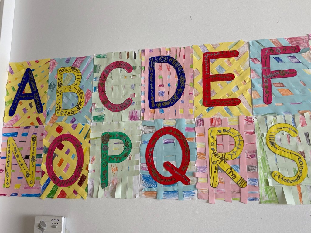 Dans une première séance, les élèves ont découpé des bandes de papier couleur qu’ils ont collé soit à la verticale, soit à l’horizontale ou de façon oblique. En parallèle, ils avaient peint les lettres de l’alphabet en capitale et réalisé du graphisme au feutre noir, une fois les lettres découpée.