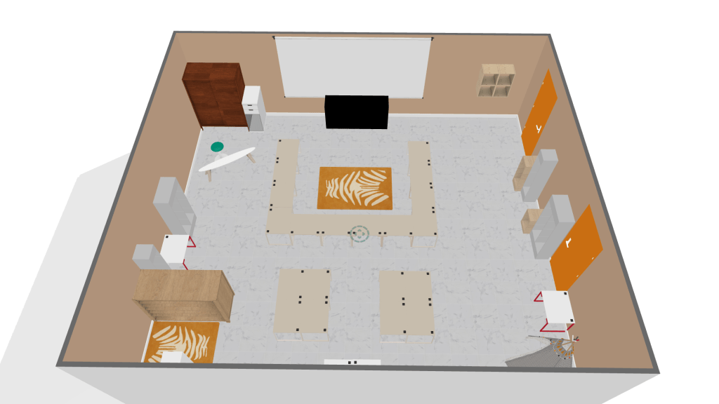 Voici des photos de ma classe avant, un plan en 3D sur le site Kozi Kaza, des photos après l’aménagement des meubles.