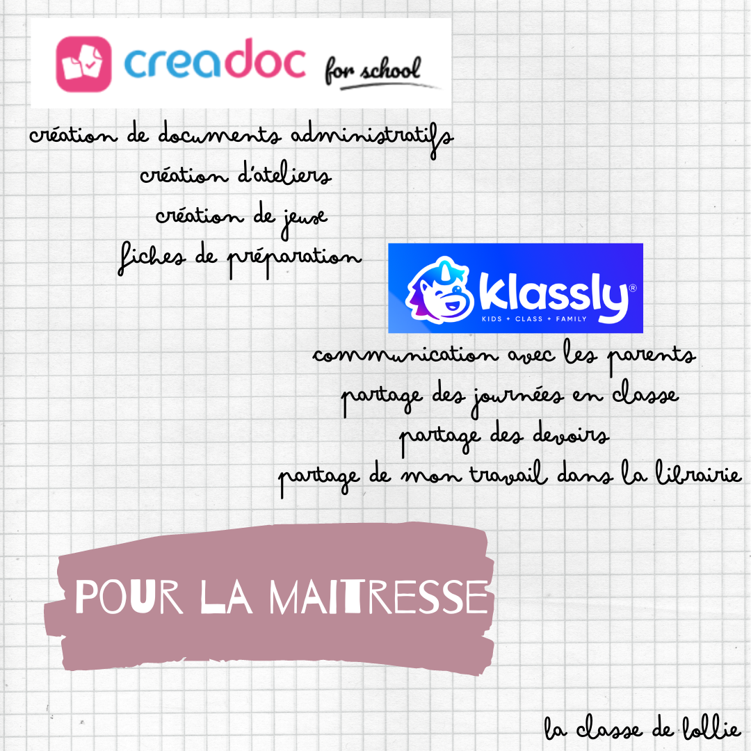 Klassly, pour communiquer avec les parents, pour partager des moments de vie de classe, pour partager les dates importantes, pour prendre rendez vous avec les parents et pour partager les devoirs en cas d’oublis.